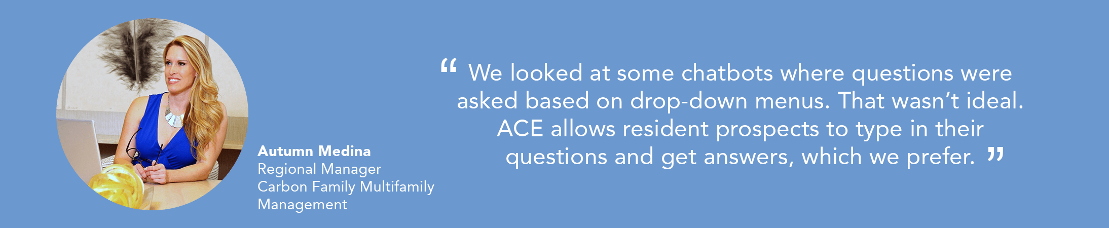 “We looked at some chatbots where questions were asked based on drop-down menus,” Medina said. “That wasn’t ideal. ACE allows resident prospects to type in their questions and get answers, which we prefer.”